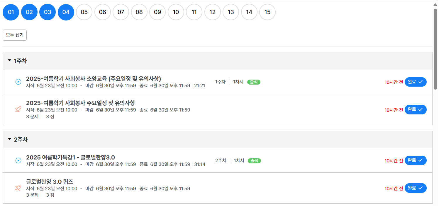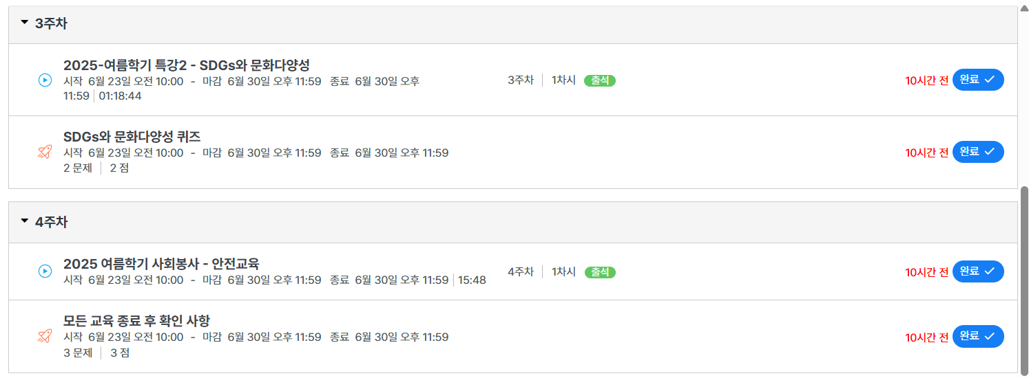1개라도 완료 누락 시, 소양교육은 미이수 처리 됩니다.