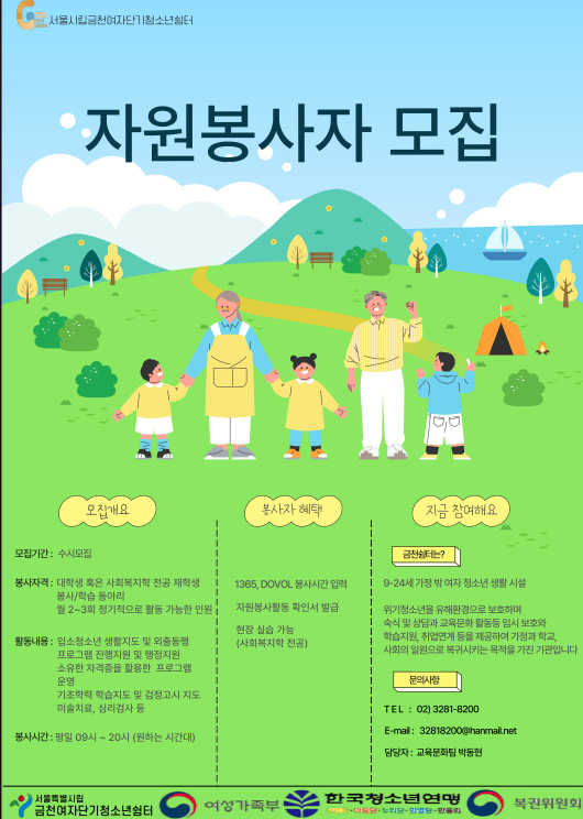서울시립금천여자단기청소년쉼터 하반기 자원봉사자 모집